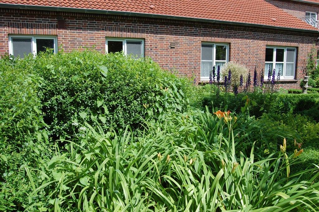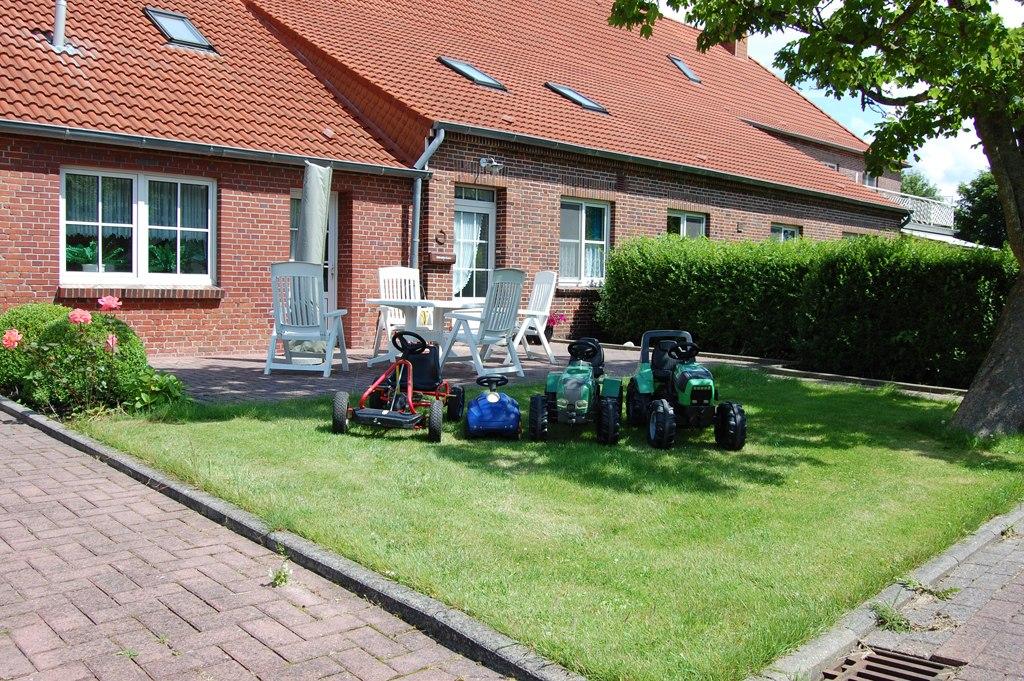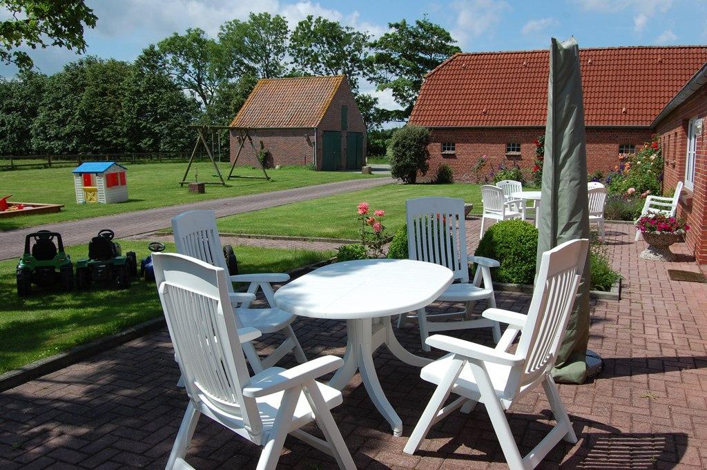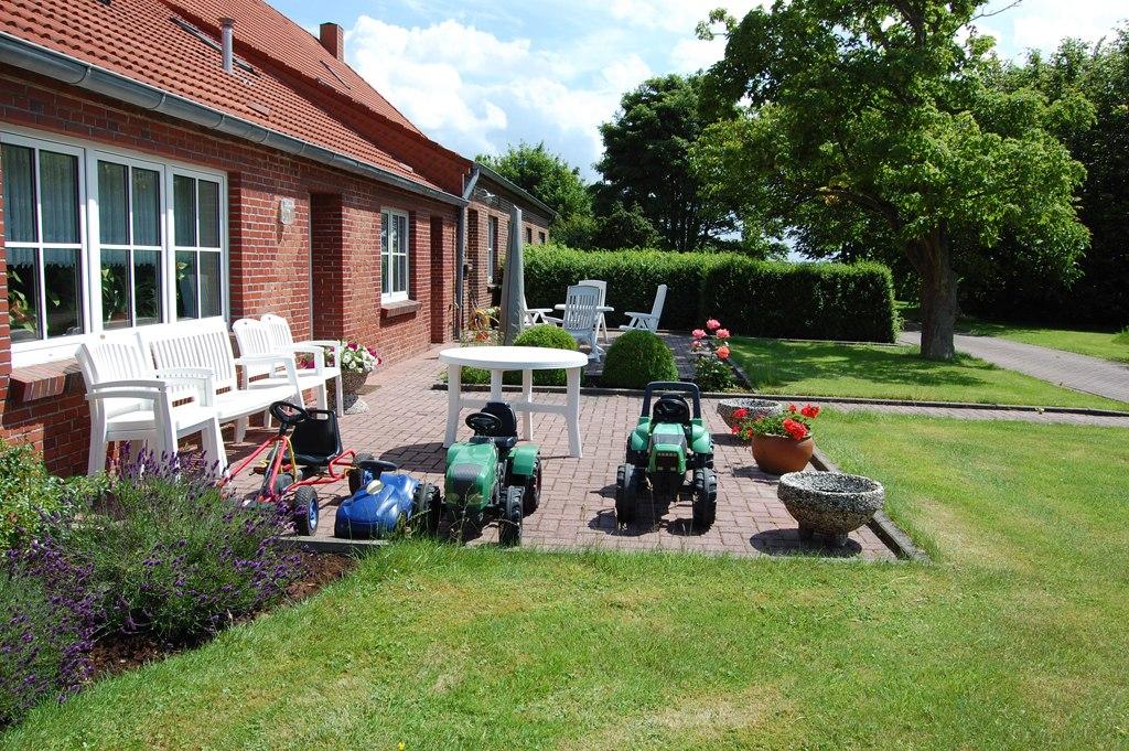 Vor der Ferienwohnung steht Ihnen eine große Terrasse zur Verfügung – mit Blick in unseren weitläufigen Bauerngarten mit altem Baumbestand, Liegewiesen und vielen Spielmöglichkeiten für Ihre Kinder.